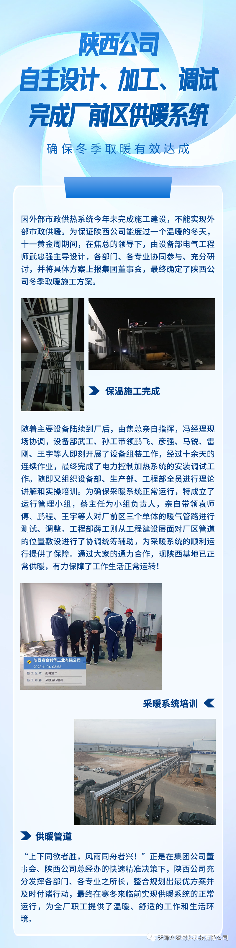 為保證陜西公司能度過一個溫暖冬天,十一黃金周期間,在陜西公司焦總的帶領(lǐng)下,由設(shè)備部電氣工程師武忠強主導(dǎo)設(shè)計,各部門、各專業(yè)協(xié)同參與、充分研討,最終確定了陜西公司冬季取暖施工方案。通過大家通力合作,現(xiàn)陜西基地已正常供暖,有力保障了工作生活正常運轉(zhuǎn)!
